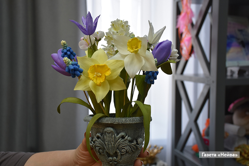 И букеты первых весенних цветов из ткани «фоамиран» и пластика — тоже тренд сезона. Благодаря мастерству Марины Барановой нежные подснежники и нарциссы смотрятся как живые!
