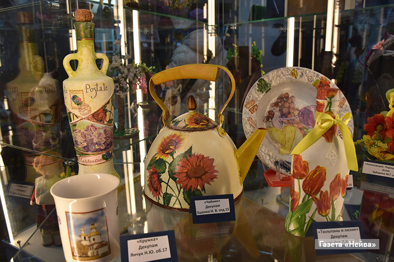 Вот целая экспозиция работ разных мастериц в технике декупаж: чайники, тарелки, кружки и даже обычная стеклянная банка из-под кофе превратились в настоящие произведения искусства!